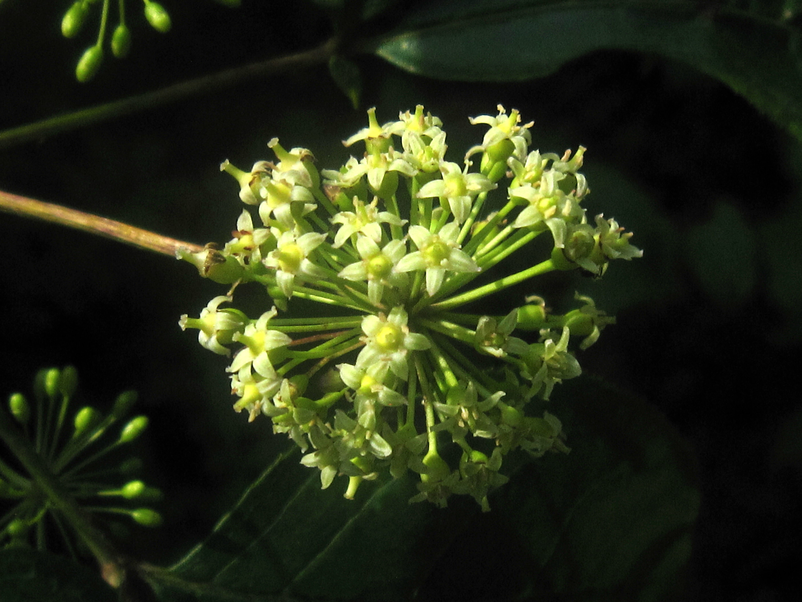 꽃은 산형꽃차례에 피는데 꽃차례는 가지 끝과 잎 사이에서 나옵니다.