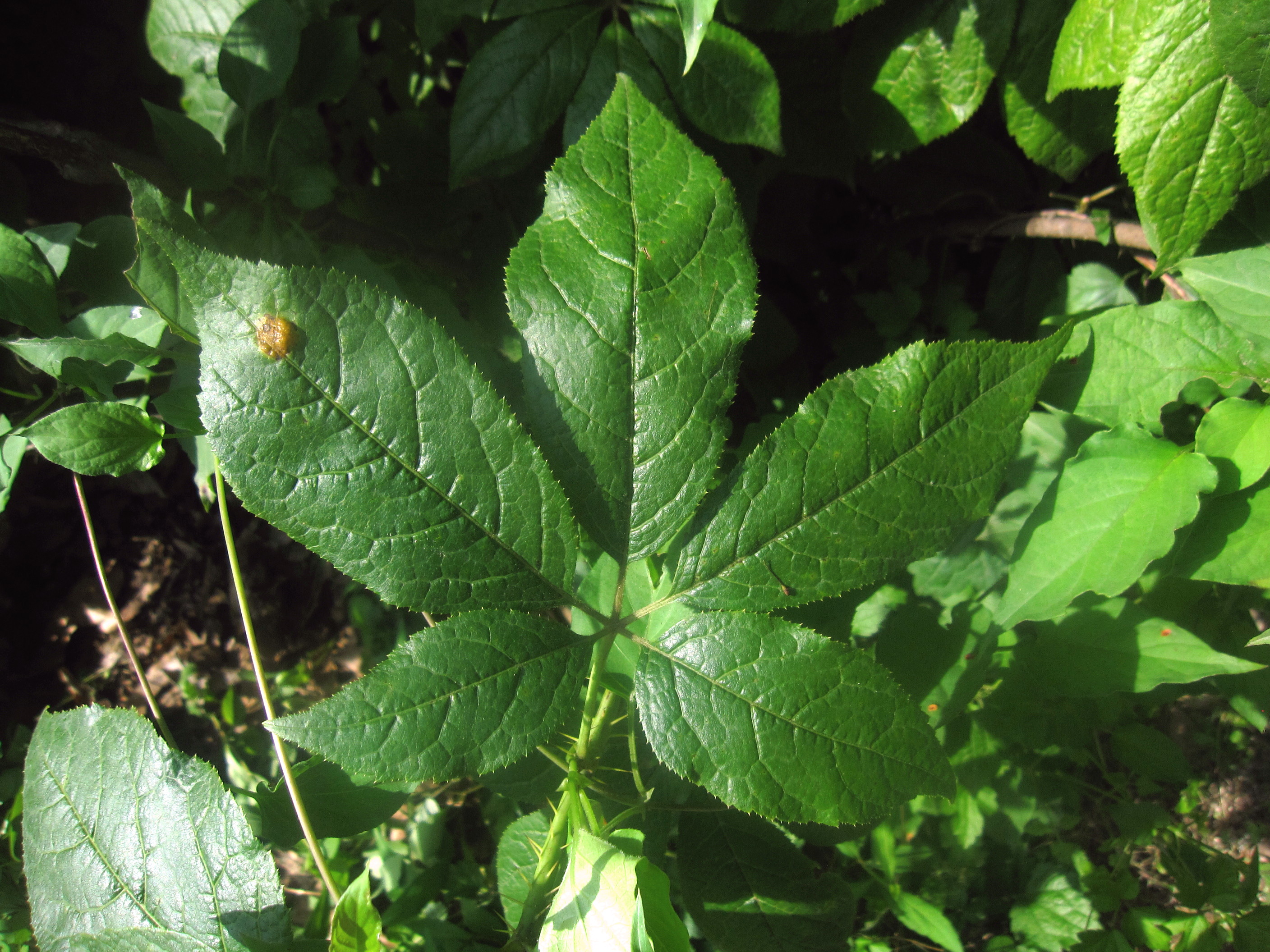 갈색 털이 있으며 잎자루에도 가시가 있다는 점이 다른 오갈피나무