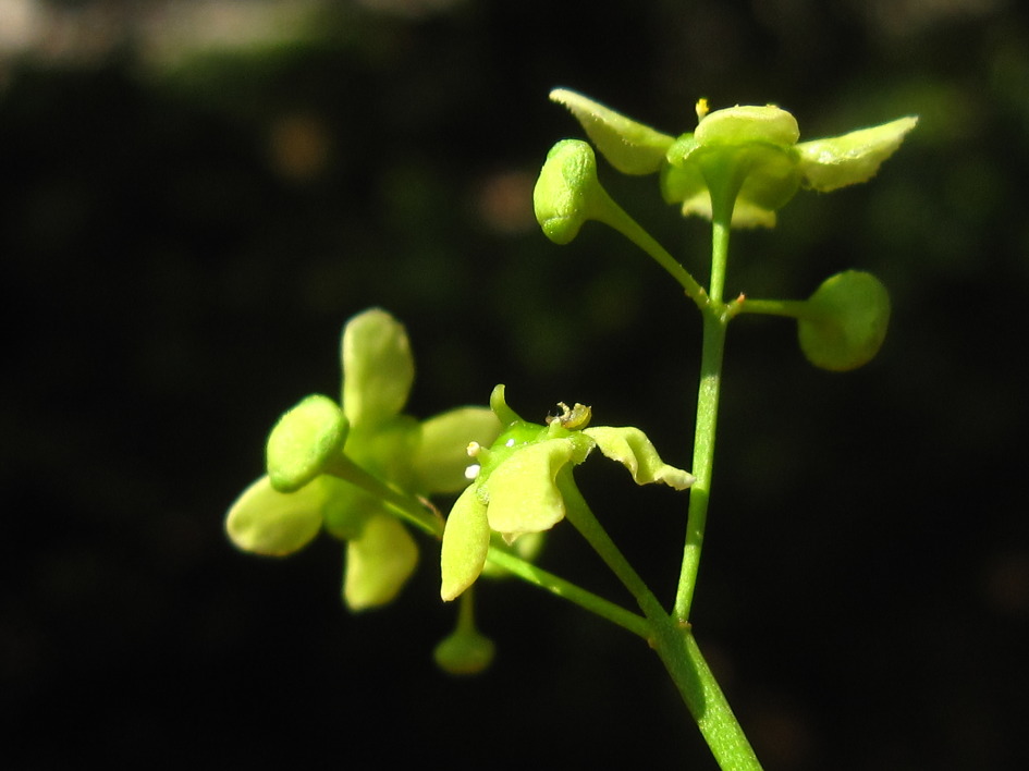 취산꽃차례를 이루는데 적갈색 꽃이 잎 주맥 위에