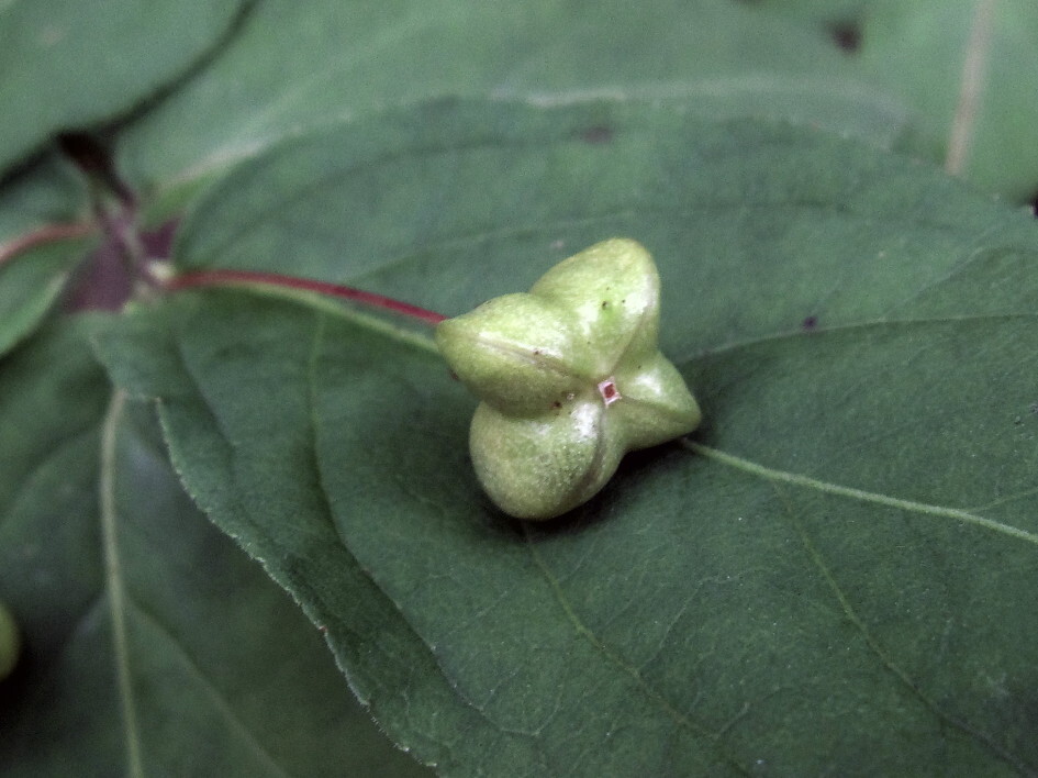 열매는 삭과이며 둥글고 붉게 익으면 4개로 갈라져서