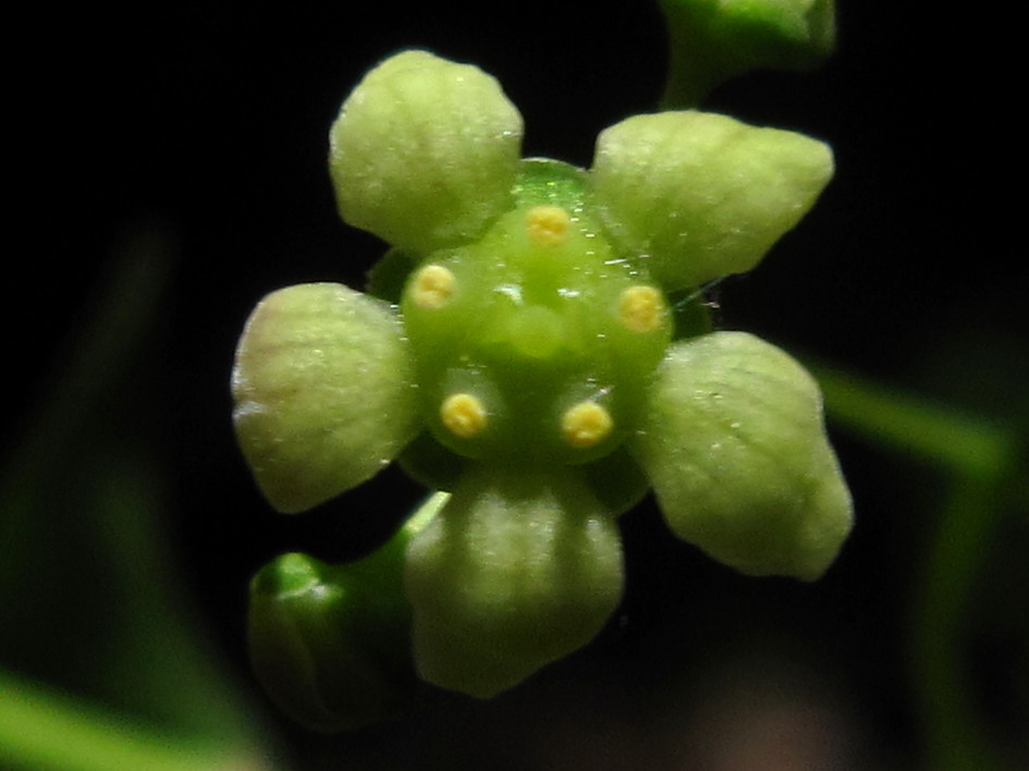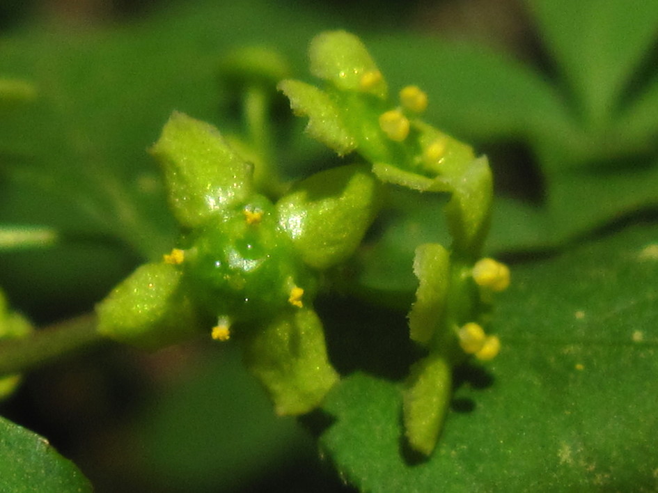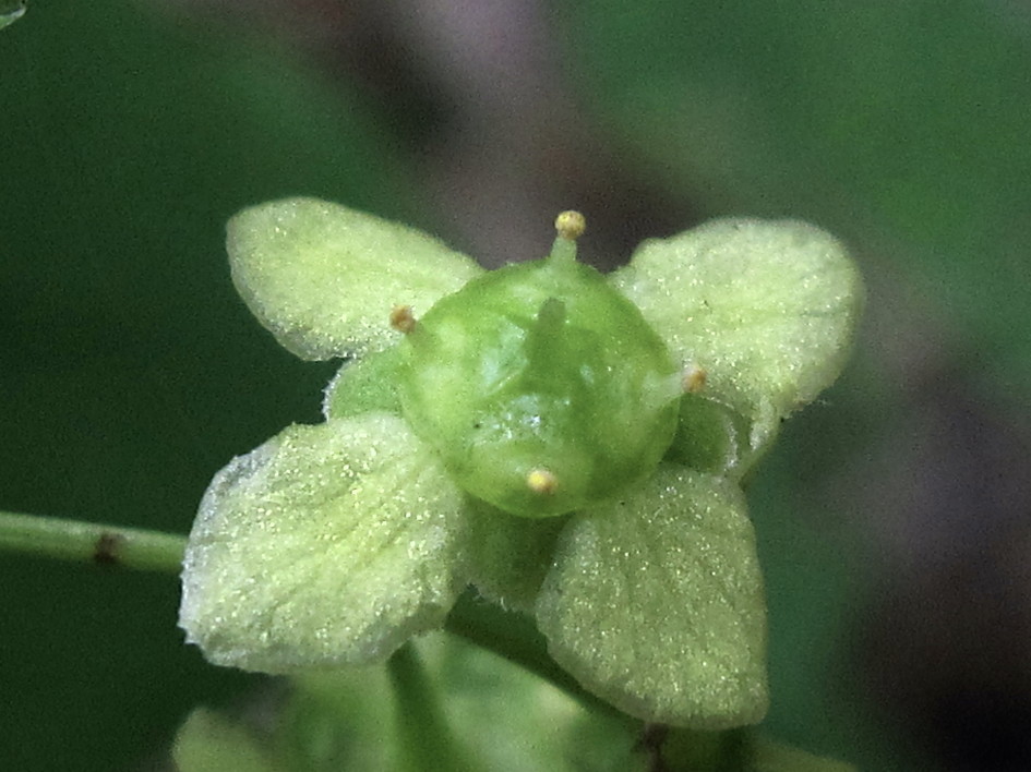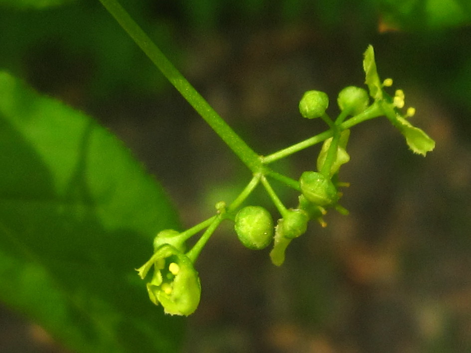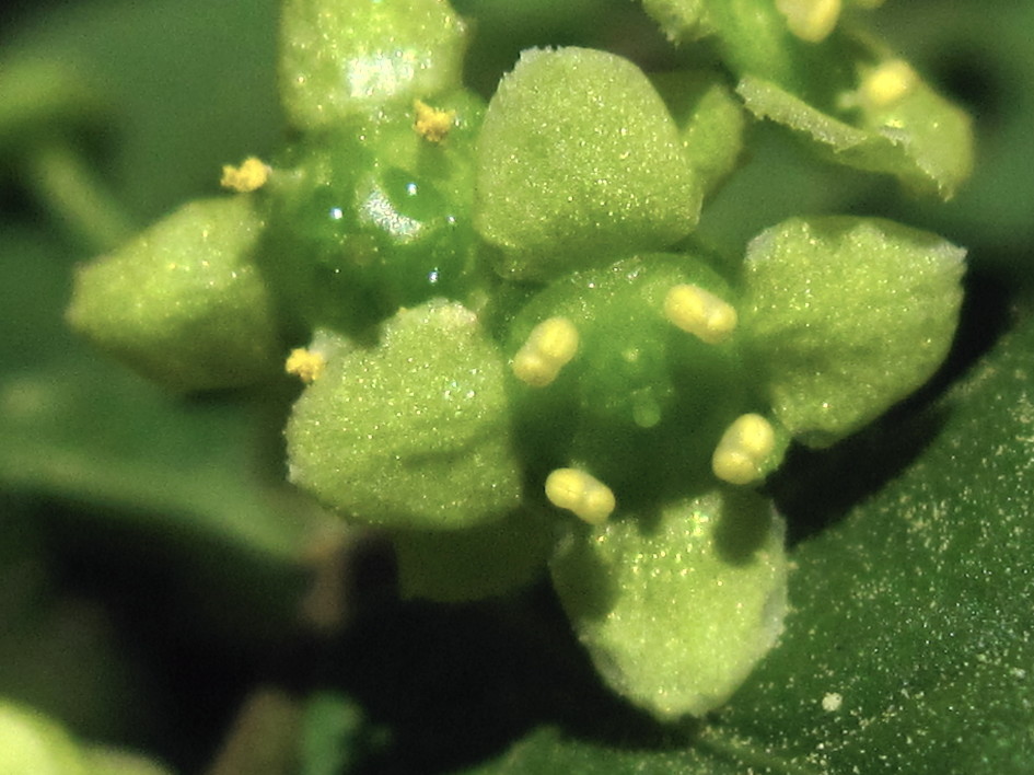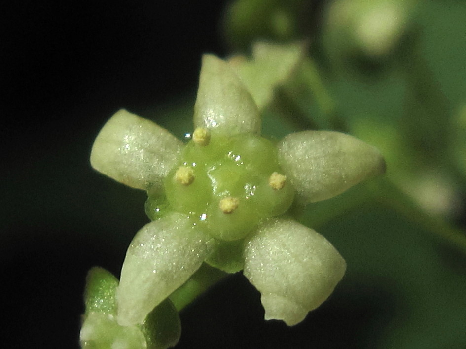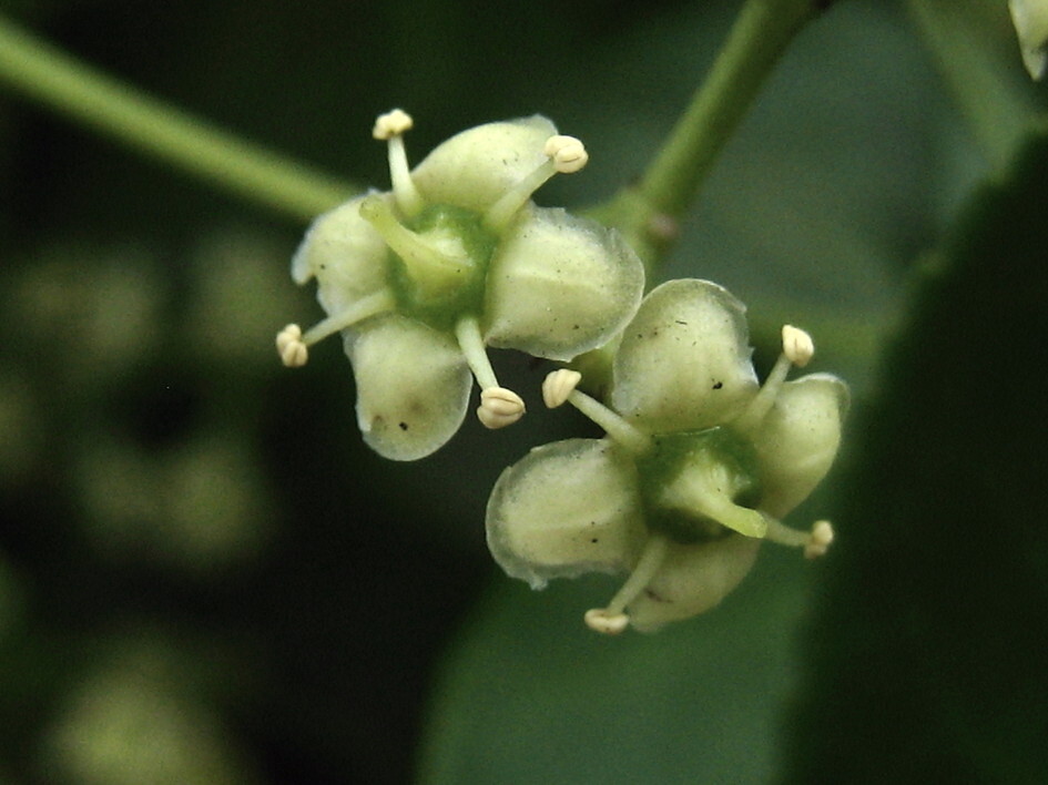 꽃은 연한 황록색이고 잎겨드랑이의 취산꽃차례에