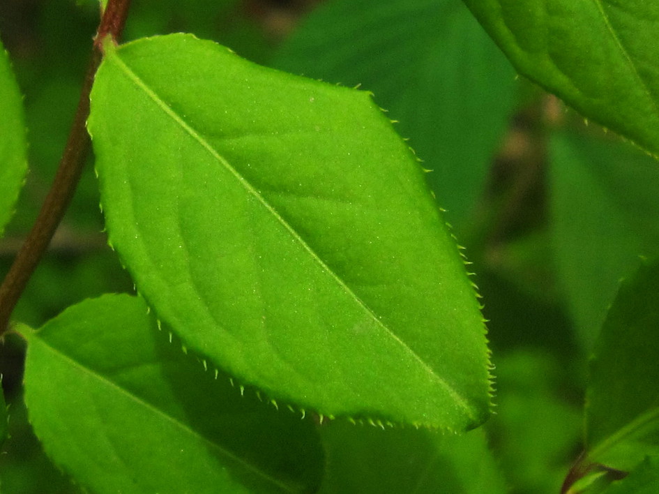 잎은 타원형이고 위쪽에 낮고 둔한 톱니가 있으며 열매는