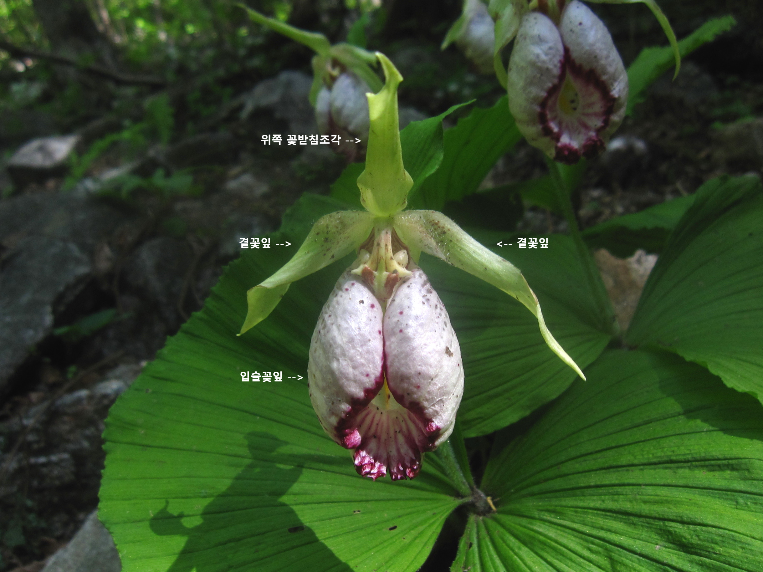 꽃은 복주머니란과 유사한데 위쪽 꽃받침조각 뒷면이 흰색이고