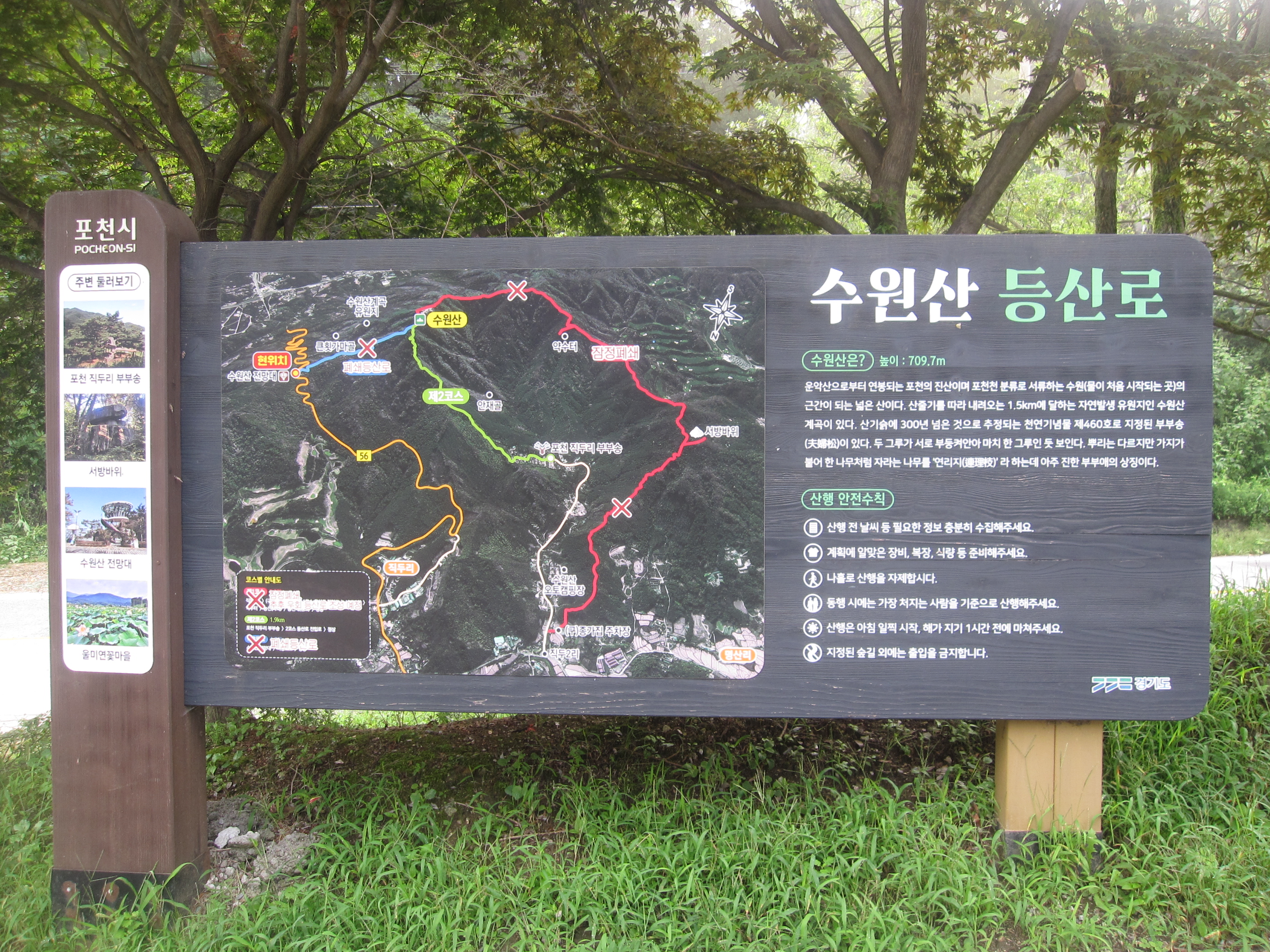 그 모퉁이에 오늘의 첫 이정표와 수원산 등산안내도가 서