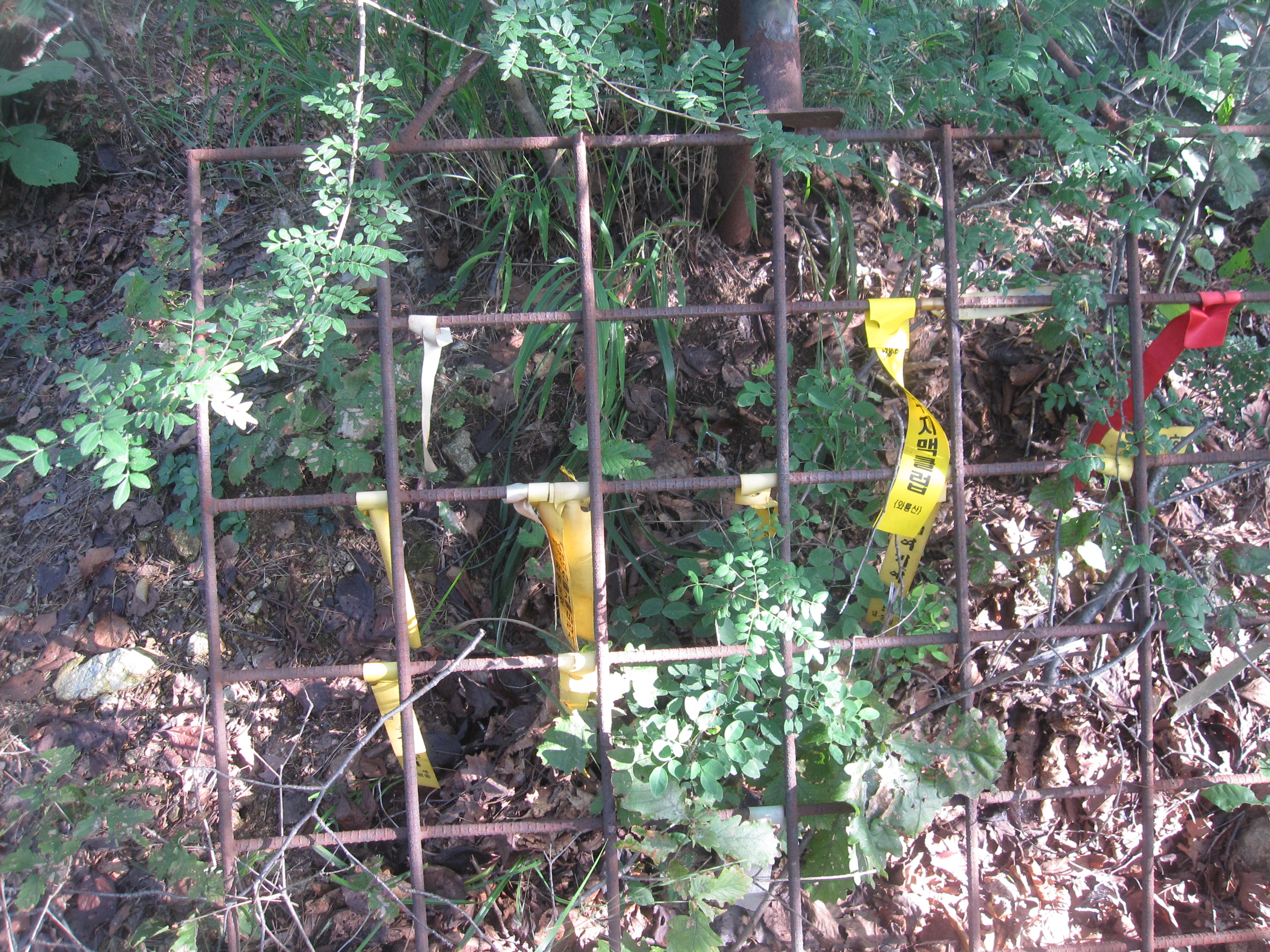 봉우리 한편에 있는 버려진 철제 그물망에 리본들이 몇 개