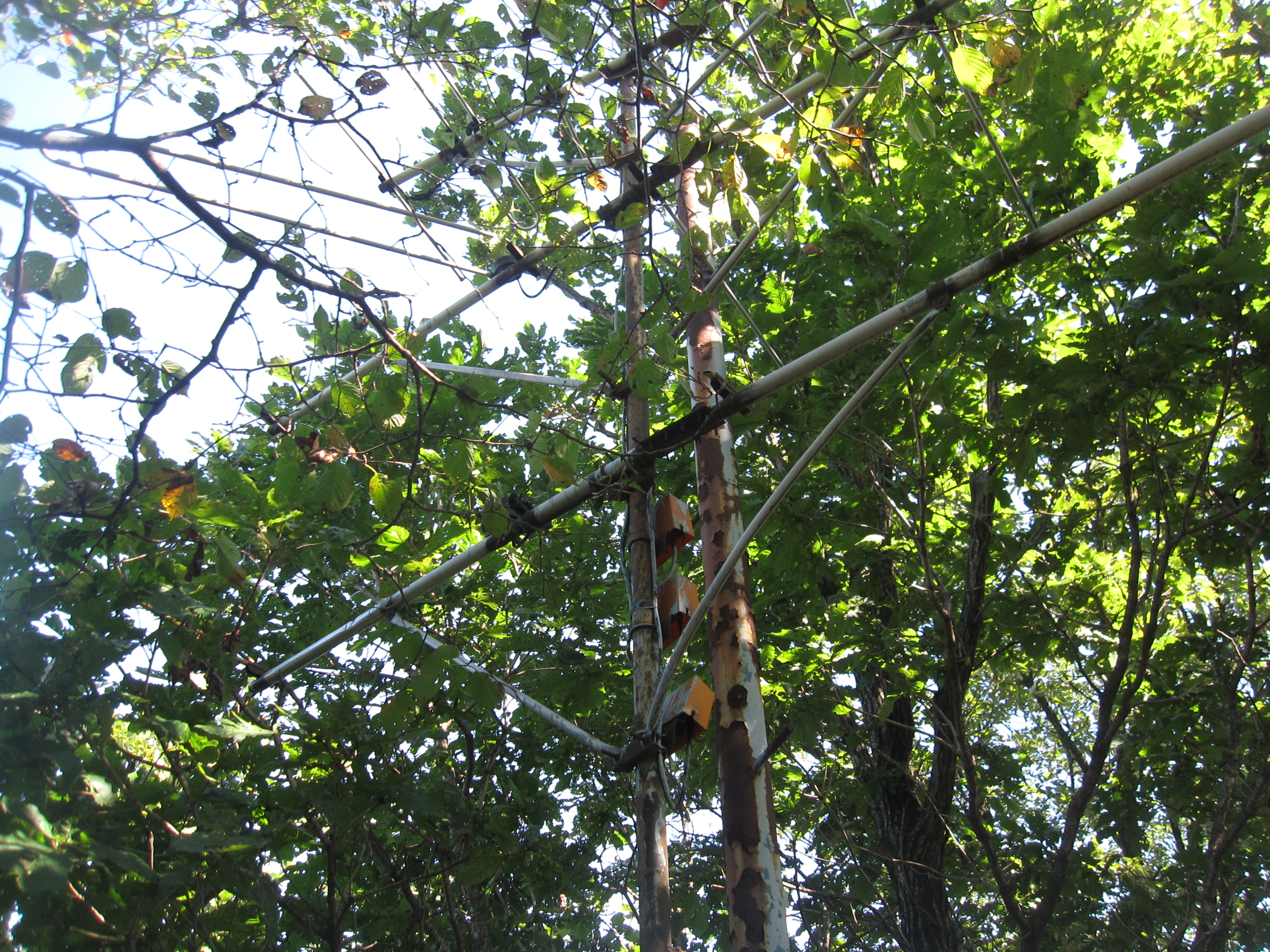 폐 안테나 철주가 녹슨 채로 방치되어 있는 낮은 봉우리를 지납니다.