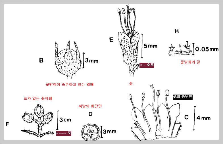 | 식물체의 털 | 개화기 이전에는 있다가 결실기로 접어들면서 점차 줄어들거나 없어짐. | 항상 성상모 밀생 |