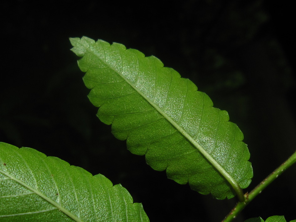 팽나무속의 나무들과는 달리 잎의 측맥은 곧게 뻗어서 톱니에