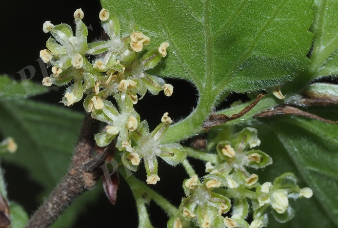 수꽃은 새가지의 잎겨드랑이에 취산꽃차례로 달리고 암꽃은
