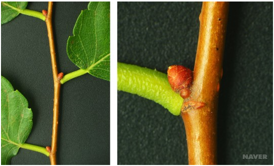 일년생가지에는 작고 둥근 갈색의 껍질눈이 많고 털이 있습니다.