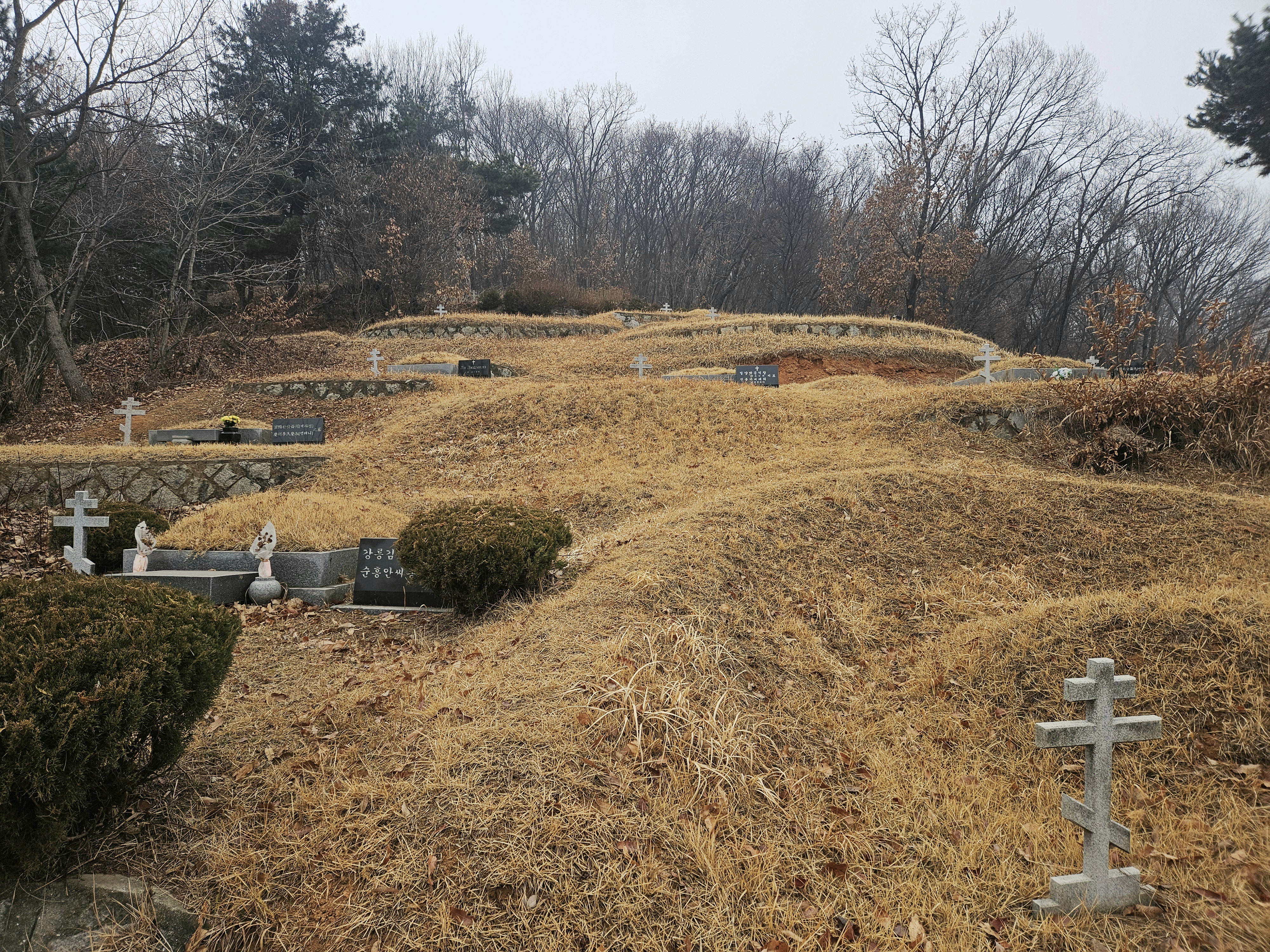 탐방로는 한 천주교 공원묘역 오른쪽으로 에돌아 나 있습니다.